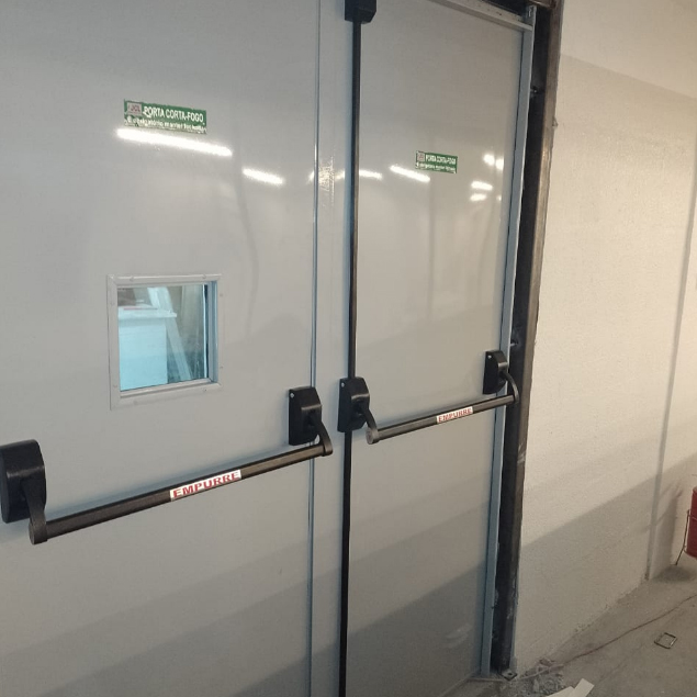 A porta metálica com visor (2 folhas) pode ser instalada em corredores amplos, acessos entre setores, halls de circulação, áreas técnicas, depósitos, almoxarifados, indústrias, centros logísticos, clínicas e escolas. É uma opção comum em locais que precisam unir resistência do conjunto com visão parcial do ambiente ao lado.